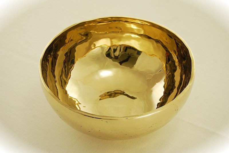 Diese Klangschale ist eine Handarbeit aus Bengalen. Sie ist neu und wurde gezielt nach altem 7-Metalle-Rezept in Handarbeit gezogen und gehämmert.