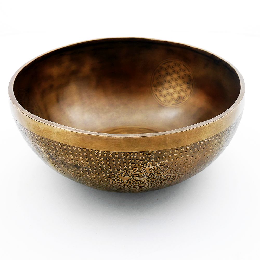 Diese Klangschale hat energetische Schwerpunkte: 3.Chakra (Solarplexus Chakra) und 4.Chakra (Herzchakra)..