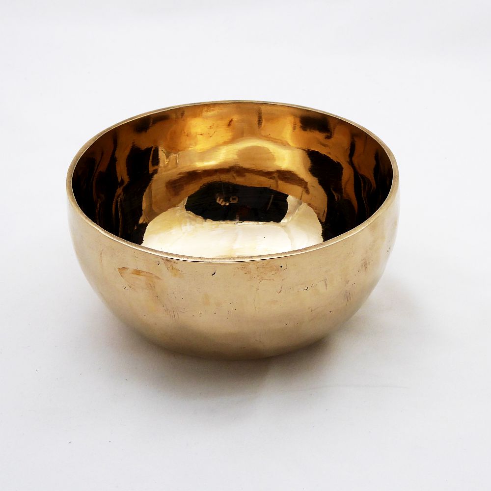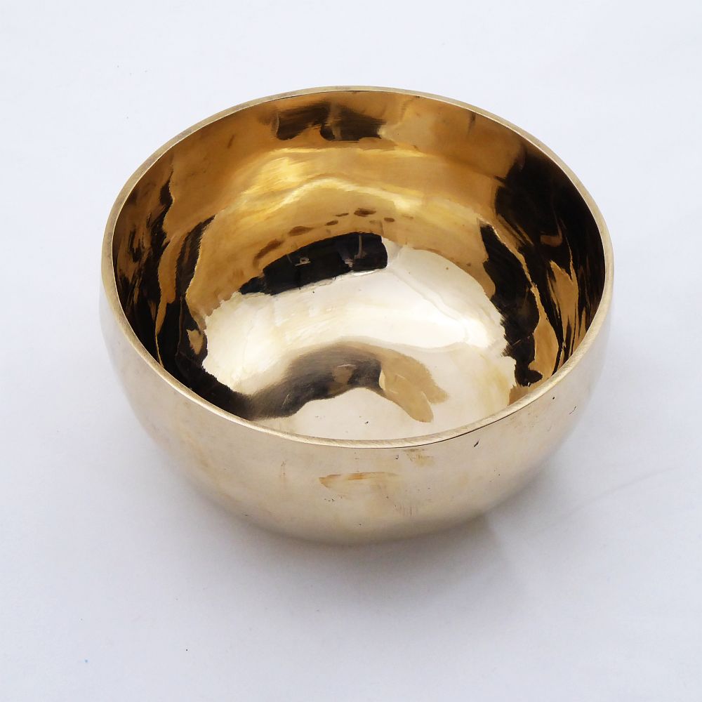 Diese Klangschale ist eine Handarbeit aus Bengalen. Sie ist neu und wurde gezielt nach altem 7-Metalle-Rezept in Handarbeit gezogen und gehämmert.